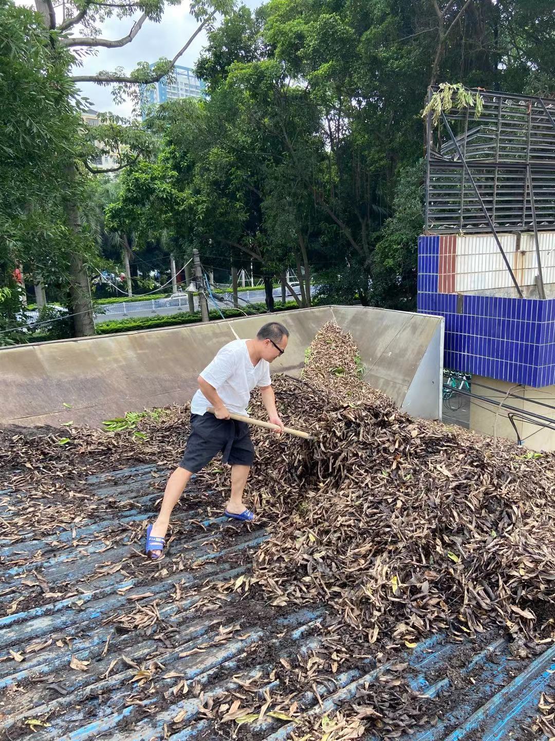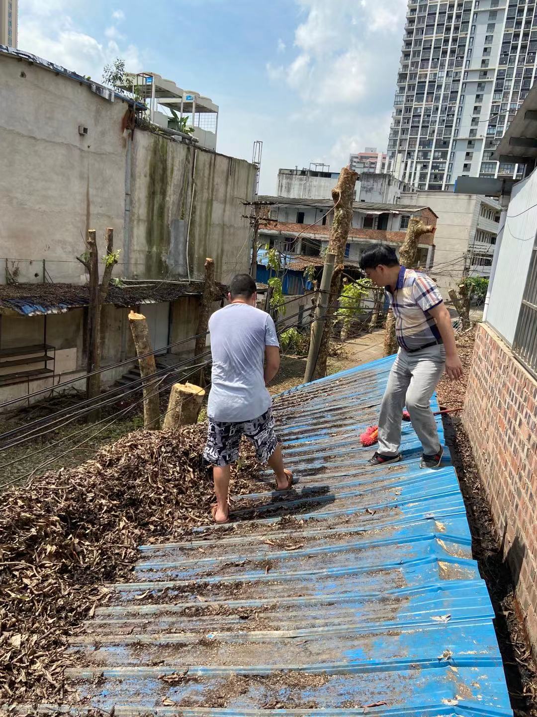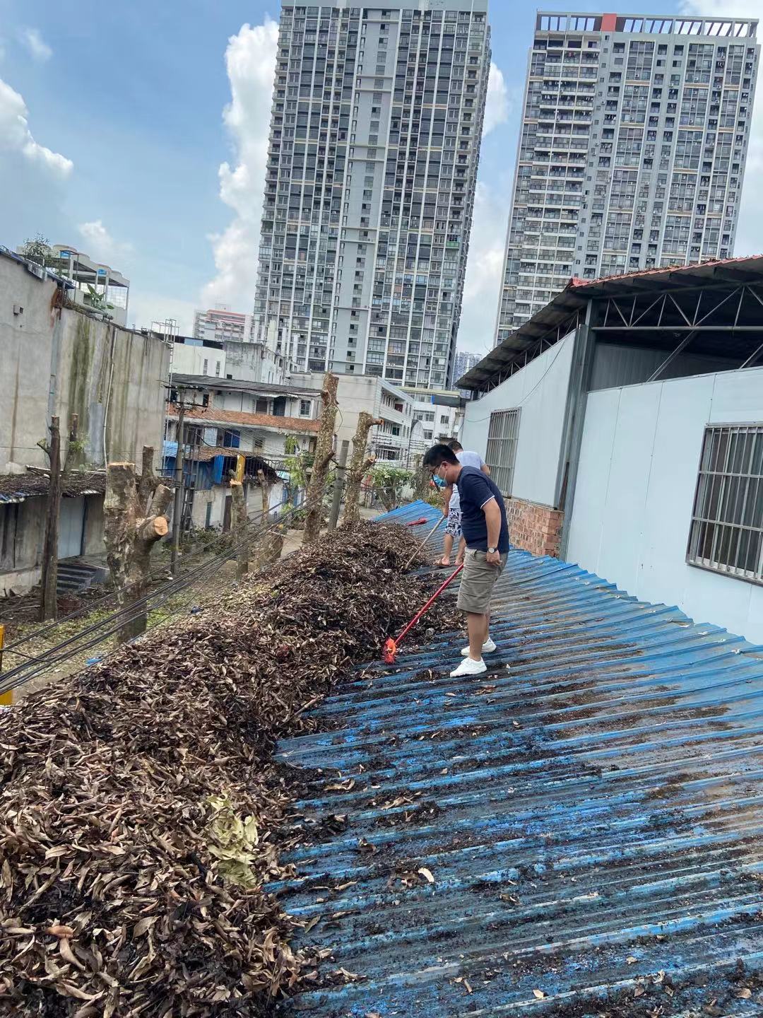 由于办公房顶的树叶积得太厚,容易生虫和漏水,公司组织员工上房顶清扫。值得一提的是涂涂亲自上阵,还不小心摔了一跤,裤子上留下深深的印记,大家既累又开心。
